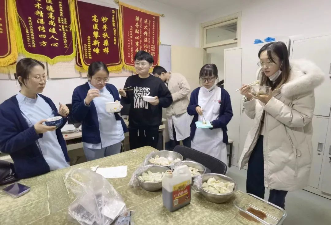 紧张的快节奏下,也有春风般的人文关怀时刻在身边。补充维生素C不可缺少,医护人员自己煮好了水果茶分给病区里的患者朋友和同事。冬至这天,一病区单珊主任和三病区李国栋主任特地准备了热腾腾的饺子送到病区,正在一线“奋战”的白衣战士们暂时卸下了盔甲,享受这片刻停歇下的能量美味。