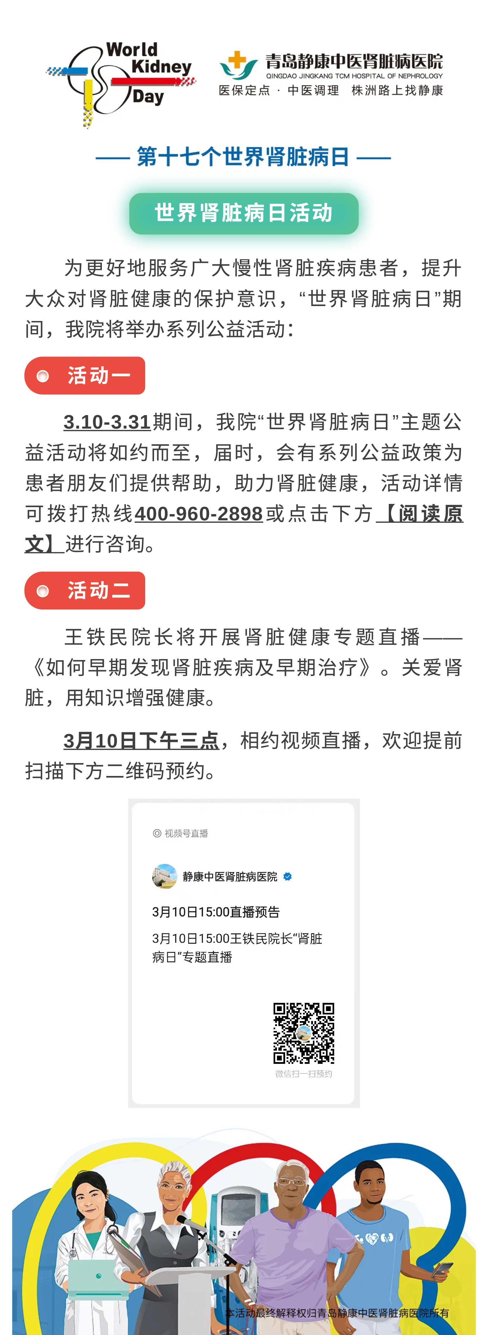 世界肾脏日,由国际肾脏病学会和国际肾脏基金联盟联合提议设立,定为每年3月份的第二个星期四,其目的在于提高人们对慢性肾脏疾病及与其相关的心血管疾病的高发病率和高死亡率的认知,让人们认识到早期检测和预防慢性肾病是目前全球急切需要解决的问题。今年世界肾脏病日的主题是“人人关注肾脏健康——吾爱吾肾,知识强肾”。
